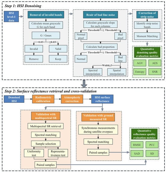 This study proposes a fast and efficient denoising workflow and then applies it to ZY1-02D HSIs SR retrieval. To address the issue of bad line identification, a pixel grayscale gradient threshold (PGGT) method is designed, and the spectral-correlation-based interpolation is leveraged to reconstruct wide bad lines. Furthermore, to tackle the challenge of validating hyperspectral SR, the SBAF method is employed to facilitate cross-validation with internationally recognized, high-accuracy MODIS SR products and ground-measured data. Finally, a set of evaluation metrics from both spatial and spectral perspectives is used for a comprehensive assessment.