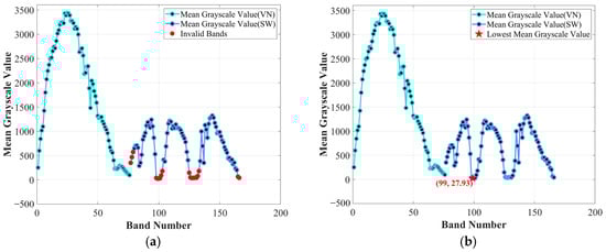 Mean grayscale values of each band. (a) Invalid bands of Data 2; (b) The lowest mean grayscale value of Data 2.