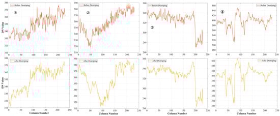Variation in DN values before and after destriping. The upper graphs represent the pre-processed data, while the lower graphs display the post-processed results. The numbering corresponds to that of Figure 7.