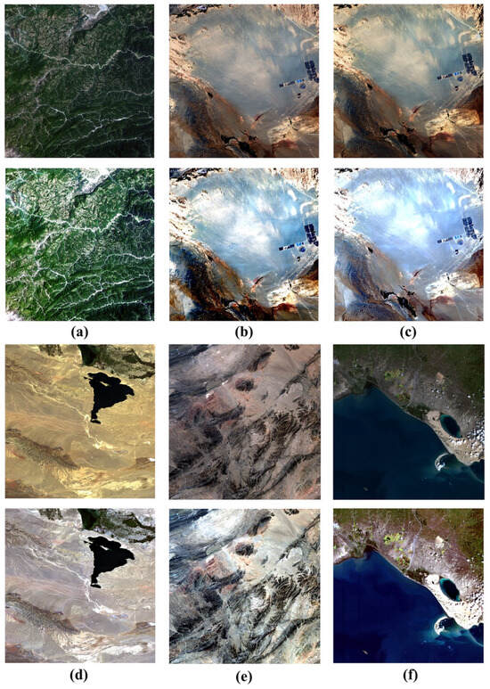 By applying the FLAASH AC method, the SR for each scene was retrieved, as shown in Figure 9. The first and third rows of Figure 9 present the original images, while the second and fourth rows display the corresponding SR.
