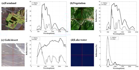 Real land cover images and their spectral curves. (a) Farmland; (b) Vegetation; (c) Gobi Desert; (d) Lake water. The spectral curves were corresponded to the pixels marked by red crosshairs in the ZY1-02D images.