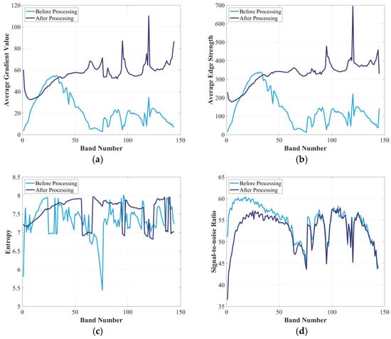 Using the methods outlined in Section 2.3.1, the AGV, AES, entropy, and SNR were calculated for each scene before and after denoising. Figure 11 presents the variations in the evaluation metrics across all bands of Data 2.