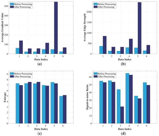 The overall image quality was represented using the AGV, AES, entropy, and SNR across all bands, as illustrated in Figure 12. Figure 12a,b reveal that both the AGV and AES increased after processing, indicating enhanced image sharpness. The substantial increase in the AGV and AES in Data 5 can be attributed to its mountainous landscape, making it more responsive to gradient extraction. Figure 12c,d indicate that information entropy and SNR follow comparable trends. Although the AC process removes some surface information, the overall denoising performance remains satisfactory.