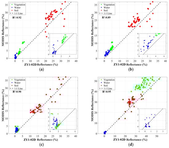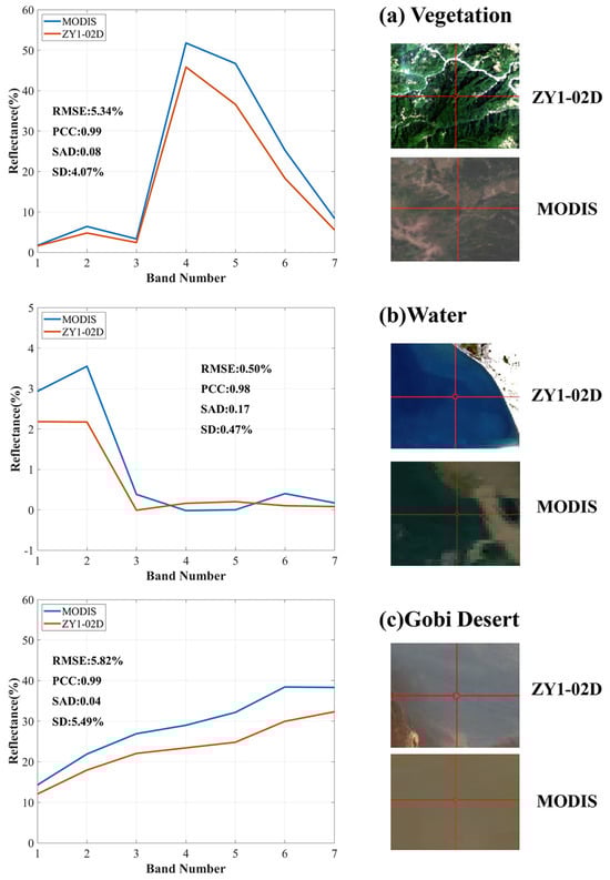 Table 2 summarizes the validation results for all the samples. Overall, the RMSE for all the samples is 6.27%, the PCC is 0.97, the SAD is 0.18, and the SD is 4.48%. The SR extracted from the ZY1-02D satellite shows the best agreement with MODIS for vegetation, followed by water, while the match is comparatively weaker for soil features.