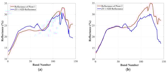 Table 3 demonstrates high spectral similarity between ZY1-02D and ground measurements: Point 1 shows RMSE = 2.24%, PCC = 0.89; Point 2 exhibits slightly lower consistency (RMSE = 3.22%, PCC = 0.84), potentially due to surface/observation variations. Figure 16 confirms strong agreement in VNIR bands, with noise-reduced SWIR bands showing improved but imperfect matching (particularly bands 70–90). Although Point 2 achieves perfect VNIR alignment, persistent SWIR discrepancies underscore the need for careful SWIR processing to preserve land surface information.