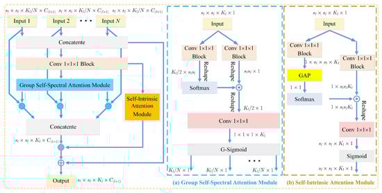 where means the output of the GSS subblock, and denotes the concatenation operation. is the 3D Conv layer with the BN layer and the ReLU function. ⊗ means the element-wise multiplication operation. and are, respectively, the group self-spectral attention module and the self-intrinsic attention module, which can be defined as