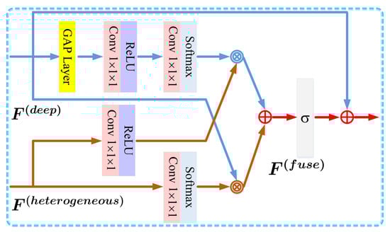 After that, due to the fact that the heterogeneous features contain more detailed information of land covers, a 3D Conv layer and a softmax function are applied to obtain the attention weight for learning of the detailed structure information of HSIs, and another 3D Conv layer with a ReLU function is also executed to align the dimension of heterogeneous features with that of the deep features, which can be written as