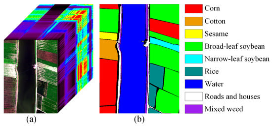 The WHU-Hi-LongKou data set. (a) Image cube. (b) Ground-truth image.