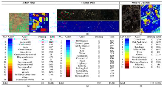 (Left) False-color maps and (Right) ground-truth maps. (a) Indian Pines (bands 20, 40, and 60). (b) 2013 Houston Data (bands 57, 27, and 17). (c) MUUFL Gulfport (bands 31, 20, and 15). (d–f) Number of the training samples.
