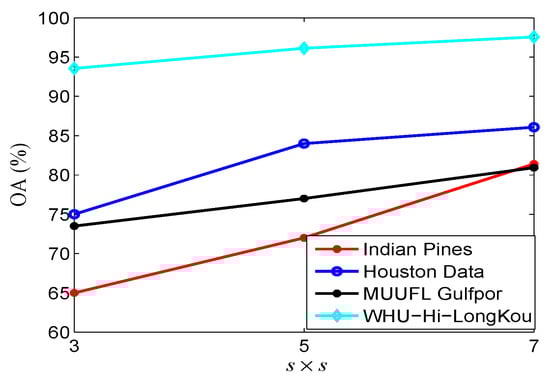 For the spatial size s, the effect of its value on the classification performance of the whole model is further studied, where s is searched from . Specifically, due to the limitations of memory, the local spatial window with a larger size fails to be supported. According to the experimental results in Figure 7, the proposed ASLNN model produces quasi-optimal classification accuracy when s is set to 7 for the four HSI data sets.