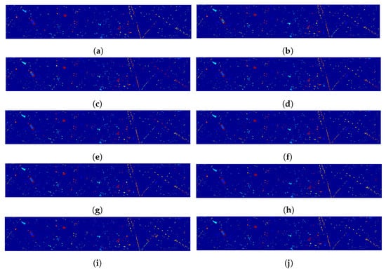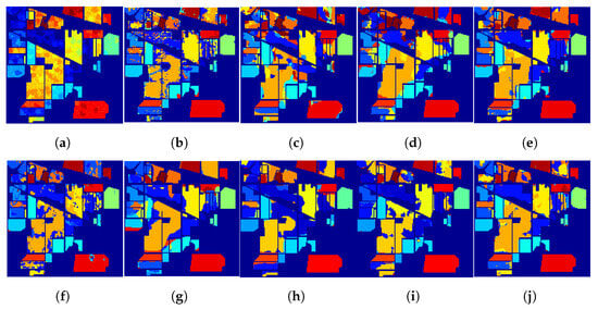 (2) Indian Pines: Using the Airborne Visible/Infrared Imaging Spectrometer (AVIRIS) sensor, the Indian Pines data set was acquired in 1992 in northwestern Indiana, USA, which consists of pixels with a spatial resolution of 20 m per pixel (mpp), and 200 bands in the wavelength range from 0.40 to 2.50 μm after removing some unusable spectral bands []. In addition, after ignoring the background pixels, 10,249 samples from 16 classes are used for experimental analysis.