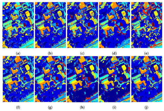 Classification maps for the MUUFL Gulfport data set. (a) ISODATA. (b) SVM-CK. (c) HybridSN. (d) SSCL3DNN. (e) 3DOC-SSAN. (f) 3DG-CNN. (g) APDCLNN. (h) D2S2BoT. (i) DBCTNet. (j) ASLNN.