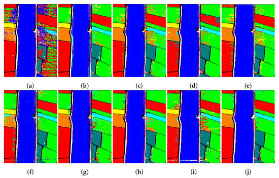Classification maps for the Indian Pines data set. (a) ISODATA. (b) SVM-CK. (c) HybridSN. (d) SSCL3DNN. (e) 3DOC-SSAN. (f) 3DG-CNN. (g) APDCLNN. (h) D2S2BoT. (i) DBCTNet. (j) ASLNN.