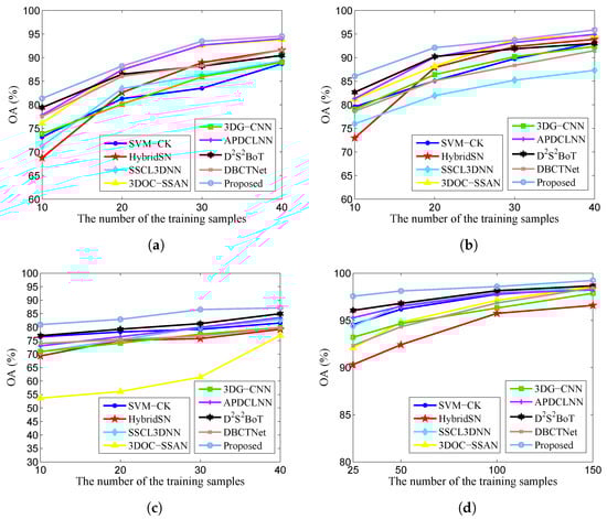 OA (%) of all considered methods under different numbers of training samples for the four HSI data sets. (a) Indian Pines. (b) Houston Data. (c) MUUFL Gulfport. (d) WHU-Hi-LongKou.