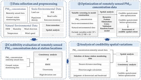 Figure 1 shows the flowchart of this study, including the processes of ① Data collection and preprocessing; ② Credibility evaluation of remotely sensed PM2.5 concentration data at station locations; ③ Analysis of credibility spatial variations; ④ Optimization of remotely sensed PM2.5 concentration data.