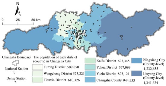 The station monitoring data collected in this study primarily include hourly PM2.5 concentration data from 1 January 2019 to 31 December 2022. These data originate from 10 national stations (Table 2) managed by the China National Environmental Monitoring Center (https://air.cnemc.cn:18007/) and 157 dense stations operated by the Changsha Ecological and Environmental Monitoring Center in Hunan Province. Figure 2 shows the distribution of ground-based stations. Quality control of the PM2.5 ground monitoring data was conducted following the statistical validity requirements of China’s Ambient Air Quality Standard (GB3095-2012) [30]. Specifically, records with missing hourly concentrations or negative values were removed from the raw data. During the calculation of daily averages, records with fewer than 20 valid hourly values within a 24 h period were excluded.