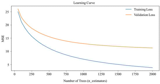 For each proposed hyperparameter set, 10-fold cross-validation [35] was performed to assess model performance. The combination yielding the lowest validation error was selected as the final hyperparameter configuration. In addition, an early stopping strategy was implemented to avoid overfitting and improve training efficiency: model training was terminated early when the MSE no longer showed significant improvement over several iterations. The optimal number of trees determined through this process was 1500 (Figure 4). The final model, trained using the optimized parameters and the selected features, achieved an R2 of 0.92 and an RMSE of 2.37 µg/m3 on the training set, and an R2 of 0.79 and an RMSE of 3.46 µg/m3 on the test set.