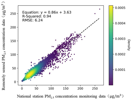 Scatter plot of the remotely sensed PM2.5 concentration data and dense station monitoring data.