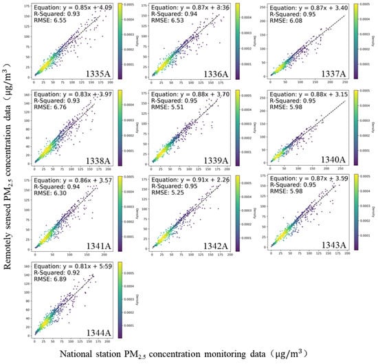 Scatter plots of the remotely sensed PM2.5 concentration data and monitoring data of each national station.