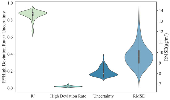 Violin plot of consistency between remotely sensed PM2.5 concentration data and dense station monitoring data. The curved sections on both sides of the violin plot represent the density of the data distribution. The wider sections indicate a higher frequency of data points around that value. The white line in the center of each violin plot represents the median (50th percentile) of the data, while the box represents the interquartile range (Q1 and Q3), which corresponds to the 25th and 75th percentiles of the data.