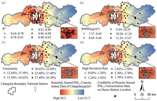 Spatial distribution of consistency between remotely sensed PM2.5 concentration data and dense station monitoring data. (a) R2 of remotely sensed PM2.5 concentration data and dense station monitoring data; (b) RMSE of remotely sensed PM2.5 concentration data and dense station monitoring data; (c) Uncertainty of remotely sensed PM2.5 concentration data and dense station monitoring data; (d) HDR of remotely sensed PM2.5 concentration data and dense station monitoring data.