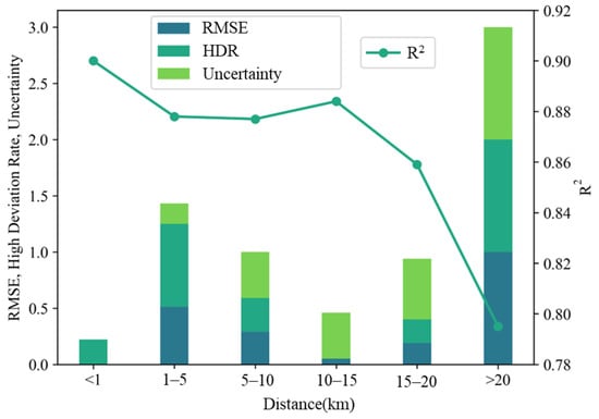 To clarify the relationship between the accuracy of remotely sensed PM2.5 concentration data and the distance to national stations, a further investigation into the spatial variation characteristics of the credibility was conducted. As shown in Figure 11, the credibility of remotely sensed data gradually declines as the distance increases from national stations. In particular, the trends of R2 and uncertainty are particularly evident, showing a stepwise deterioration. The following three credible intervals can be roughly divided from the results: ① high credible range (0–1 km): R2 maintains superior performance (>0.90), indicating high credibility of the remotely sensed PM2.5 concentration data; ② transitional stability range (1–15 km): exhibiting stabilized yet diminished measurement indicators of credibility; ③ critical decay boundary (>15 km): a phase transition manifests through precipitous quality deterioration, characterized by the uncertainty surge to 20% and R2 decline to 0.86. The credibility of the remotely sensed data significantly decreases when the distance from national stations is over 15 km, making it difficult to meet the needs of accurate PM2.5 monitoring.