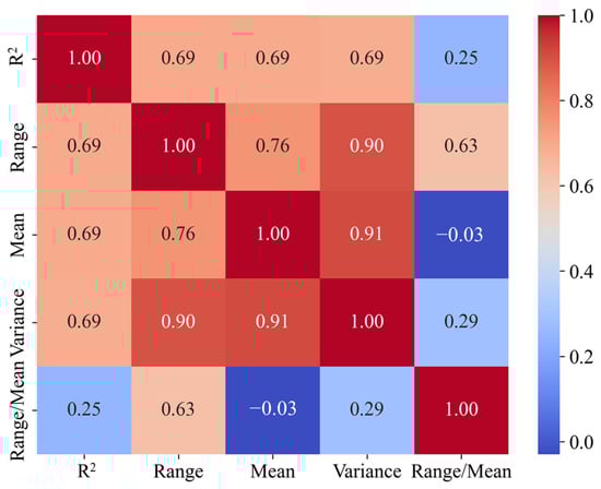 Heatmap of R2 values with dense station monitoring data statistics (range/mean/variance/range–mean ratio). Both the x-axis and the y-axis represent the statistics of the dense station monitoring data.