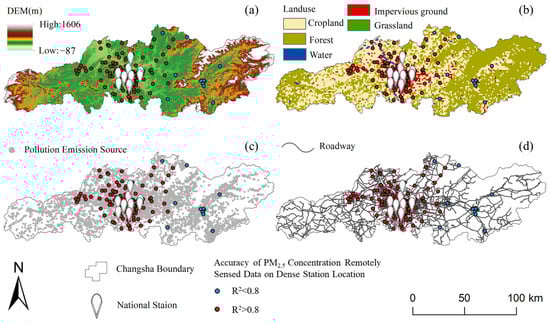 Spatial distribution of R2 values between remotely sensed PM2.5 concentration data and ground-based monitoring data in relation to geographical environmental factors. (a) Distribution of remotely sensed PM2.5 concentration data credibility with elevation; (b) Distribution of remotely sensed PM2.5 concentration data credibility with land use; (c) Distribution of remotely sensed PM2.5 concentration data credibility with pollution emission source; (d) Distribution of remotely sensed PM2.5 concentration data credibility with roadway.