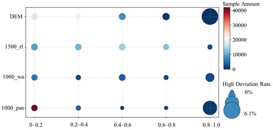Figure 14 quantitatively illustrates the relationship between various geographical factors and the HDR. The y-axis represents various geographic environmental variables surrounding each station, including elevation, road length within a 1500 m buffer (1500_rl), water area within a 1000 m buffer (1000_wa), and the number of pollution source within a 1000 m buffer (1000_psn). To facilitate comparison within a single figure, the values of these geographic factors were normalized and divided into five groups as the x-axis. The color of each point indicates the sample amount, and the size of each point reflects the HDR. The figure clearly demonstrates that both elevation and the number of pollution sources are significantly associated with the probability of large deviations in remote sensing data. Specifically, higher elevations and greater numbers of pollution sources correspond to a markedly increased probability of high deviation, indicating reduced credibility of remotely sensed data under such geographic conditions.