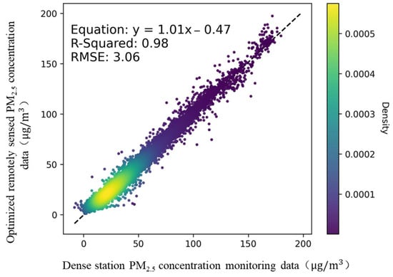 Scatter plot of overall optimized remotely sensed PM2.5 concentration data and dense station monitoring data.