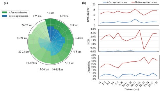 Credibility change plot of remotely sensed PM2.5 concentration data in a certain range around national stations before and after optimization. (a) Changes in R2 values of remotely sensed PM2.5 concentration data before and after optimization; (b) Changes in RMSE, HDR, uncertainty of remotely sensed PM2.5 concentration data before and after optimization. (a) shows the radial range of R2 value changes, with the horizontal axis (in angular direction) representing different distance intervals from the national stations.