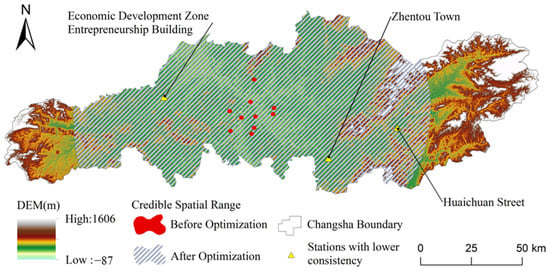 Lower-consistency station locations and spatial distribution of credible coverage changes in remotely sensed PM2.5 concentration data before and after optimization.