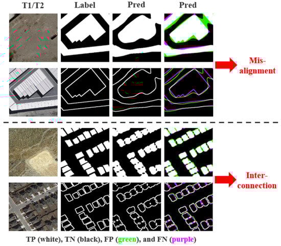 Although existing change detection methods have shown satisfactory performance, there is still room for improvement. Accurately discriminating the edge details of change areas remains challenging. As shown in Figure 1, the boundaries of large change areas exhibit misalignment, and the boundaries of small change targets tend to become interconnected. Possible reasons for these challenges include insufficient focus on change features and a lack of constraints on the boundaries between change areas and the background. Additionally, during the commonly used pooling process in feature extraction, regional information may be smoothed or blurred, leading to distortion in data distribution and, subsequently, affecting boundary discrimination. Accurately discriminating the boundaries between change areas and the background contributes to improving the overall effectiveness of change detection tasks. Such improvement is essential for addressing more complex application scenarios.