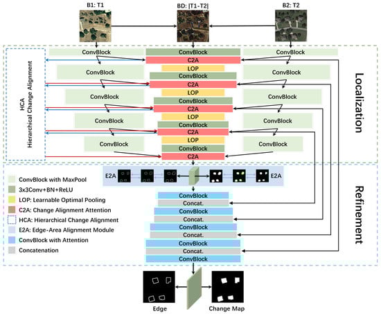 To address the aforementioned issues, this paper proposes a novel change detection network, LRNet, based on a strategy that involves localization (detecting change areas) followed by refinement (detecting change edges). In the localization stage, a three-branch encoder simultaneously extracts original image features and their differential features, while allowing interaction among the branches to localize the position of each change area. To minimize information loss during feature extraction, learnable optimal pooling (LOP) is proposed as a replacement for the widely used max pooling. Additionally, LOP is trainable and participates in the overall optimization of the network. To effectively integrate features from different branches and accurately localize change areas of various sizes, we propose the change alignment attention (C2A) mechanism and the hierarchical change alignment (HCA) module. C2A is employed to integrate change features from different branches, enhancing attention to change areas in a more targeted manner, reducing focus on the background, and generating the change alignment attention map (C2AM). These enhanced features are then skip-connected to the corresponding level in the refinement stage to assist in the discrimination of change area edges. HCA hierarchically propagates C2AM in a densely connected manner to subsequent levels, aiding in the comprehensive discrimination of attention weights at different granularities. This ensures that attention maps generated for deep features are more representative and global, facilitating the accurate discrimination of change areas. In the refinement stage, the proposed edge-area alignment module (E2A) corrects change areas and change edges of the localization results, providing a good start for subsequent edge refinement. Then, the decoder, combined with the C2A-enhanced differential features from the localization stage, refines the change areas of different sizes and their edges. To address sample imbalance, this paper adopts a hybrid loss function combining binary cross-entropy (BCE) and intersection over union (IoU) for supervised training optimization. Finally, we obtain results with accurate discrimination of change areas and boundaries. The main contributions of this paper include the following points: