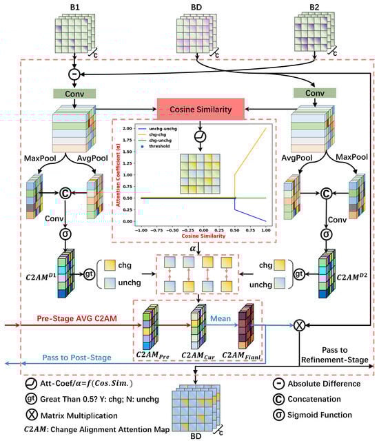Each branch consists of five convolutional blocks, each comprising several convolution layers, batch normalization layers, and ReLU layers. Branches B1 and B2 also include max-pooling layers. The output of the y-th () convolutional block in branch B is denoted as . After each convolutional block, we utilize the proposed change alignment attention (C2A) and hierarchical change alignment (HCA) modules to integrate features from different branches, thereby accurately localizing change areas of different sizes. The feature transformation in C2A is described in Equation (2). Details about C2A and HCA are provided in Section 3.3 and Section 3.4, respectively.