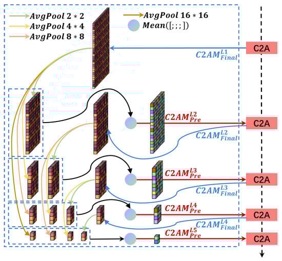 In the network architecture, features at different levels exhibit varying granularity and receptive fields, which can be utilized for identifying targets of different sizes. To effectively synthesize change-aligned attention from different granularities, the hierarchical change alignment (HCA) module is proposed. The structure of HCA is depicted in Figure 5. HCA propagates the change alignment attention maps (C2AM) output from different levels of C2A to subsequent levels in a densely connected manner, facilitating comprehensive discrimination of attention weights at multiple granularities. It ensures that the attention weight generation for deep features is more representative, which is conducive to the identification of change targets of various sizes.