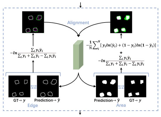 To provide a solid foundation for the refinement stage, the edge-area alignment module (E2A) is designed to constrain and rectify the change areas and edges identified in the localization stage. The E2A procedure is illustrated in Figure 6. Firstly, the output from the localization stage is processed using a convolution and sigmoid function to obtain the inference result of the change areas. Subsequently, the Canny algorithm [] is applied to the change areas to obtain the edge detection results. Comparing the inference result with the ground truth, different loss functions are employed for supervision. Inspired by lane detection in autonomous driving [], it is more stable to use the intersection over union (IOU) for evaluation and constraints when the target proportion is significantly smaller than the background, which allows us to focus primarily on the less-targeted category. Specifically, we employ the IoU loss function to constrain the detection of change edges, while for change areas, we combine the binary cross-entropy loss and IoU loss functions to apply a joint constraint. Equations (12) and (13) are the formulas for the binary cross-entropy loss function and IOU loss function, respectively.