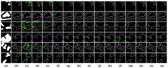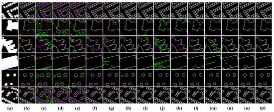 Visualization of edges in the change detection results on the LEVIR-CD dataset; (a) Label area; (b) Label edge; (c) FC-EF; (d) FC-Siam-Conc; (e) FC-Siam-Diff; (f) DASNet; (g) SNUNet; (h) DSIFN; (i) DESSN; (j) BIT; (k) VcT; (l) DMINet; (m) GeSANet; (n) EATDer; (o) TCD-Net; (p) LRNet. For convenience, several colors are used to facilitate a clearer visualization of results: i.e., TP (white), TN (black), FP (green), and FN (purple).