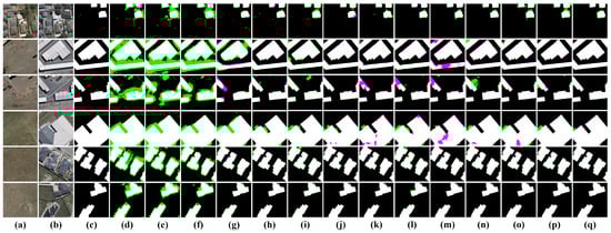 Visualization of change detection results on the WHU-CD dataset; (a) T1 image; (b) T2 image; (c) Label; (d) FC-EF; (e) FC-Siam-Conc; (f) FC-Siam-Diff; (g) DASNet; (h) SNUNet; (i) DSIFN; (j) DESSN; (k) BIT; (l) VcT; (m) DMINet; (n) GeSANet; (o) EATDer; (p) TCD-Net; (q) LRNet. For convenience, several colors are used to facilitate a clearer visualization of results: i.e., TP (white), TN (black), FP (green), and FN (purple).