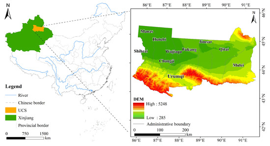 The UCS region (comprising Urumqi City, Changji Hui Autonomous Prefecture, and Shihezi City) is located in northern Xinjiang (42°52′N–45°28′N, 88°40′E–91°33′E), situated within the ecological transition zone between the southern margin of the Junggar Basin and the northern slopes of the Tianshan Mountains. The total area of this region is approximately 86,000 km2 (Figure 2), and it serves as a strategic hub within the core area of the Silk Road Economic Belt. The regional geomorphology is predominantly alluvial fan plains, with a topography that slopes from high elevations in the south to lower elevations in the north. The elevation varies from 450 to 2200 m. The region experiences a typical temperate continental arid climate, characterized by an annual precipitation of 160–220 mm, high evaporation rates of 2000–2800 mm, and an aridity index exceeding 4.0. Water resources are primarily dependent on glacial meltwater and groundwater recharge. Vegetation cover exhibits significant heterogeneity, with natural vegetation primarily comprising desert steppe and halophytic shrubs, whereas oasis agriculture is concentrated along riverbanks. Deserts and gravelly Gobi surfaces account for a large proportion of the land area. Over the past four decades, urbanization in the region has been accelerating, with a continuous expansion of built-up land from 1990 to 2020. The regional GDP maintained an average annual growth rate of 9.8%, contributing 45.2% of Xinjiang’s total economic output [24,25].