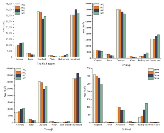 An analysis of quantitative land use changes from 1990 to 2020 revealed significant trends in regional development and land use structure within the UCS region (Figure 4). Data from four time points indicated that cropland and built-up land increased steadily, while forest land and water areas declined. Grassland initially declined and subsequently recovered, while unused land underwent a sharp rise around 2010 before receding. Specifically, in the UCS region as a whole, cropland expanded by 2759.78 km2 (an increase of 29.54%), and built-up land surged by 1471.58 km2 (a 190.09% increase). In contrast, forest land shrank by 1211.50 km2 (a 37.53% reduction) and grassland diminished by 4112.40 km2 (a 10.69% decline), while unused land expanded by 1647.86 km2 (a 4.63% increase). A more detailed examination of subregions revealed distinct patterns. In Urumqi City, all ecological land types—including cropland, forest land, grassland, and water area—declined. Specifically, cropland contracted by 233.56 km2 (17.18%), forest land by 239.41 km2 (36.86%), grassland by 695.21 km2 (8.67%), and water area by 140.24 km2 (38.40%). Conversely, built-up land expanded by 595.55 km2 (204.58%) and unused land grew by 712.89 km2 (22.54%). In Changji Prefecture, cropland increased by 3053.46 km2 (39.79%) and built-up land by 786.59 km2 (175.41%), while forest land, grassland, and water area decreased by 968.45 km2 (37.64%), 3396.19 km2 (11.19%), and 409.49 km2 (44.21%), respectively; unused land showed a modest rise of 933.33 km2 (2.88%). In Shihezi City, ecological areas declined sharply, with cropland reducing by 60.12 km2 (19.41%), forest land by 3.62 km2 (60.84%), and grassland by 20.94 km2 (20.67%), while built-up land and unused land increased by 89.44 km2 (258.42%) and 1.64 km2 (136.67%), respectively.