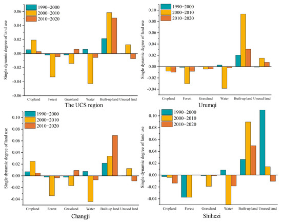 As shown in Table 5, between 1990 and 2020, the comprehensive land use dynamic degree in the UCS area averaged 0.22%, with values of 0.32% in Urumqi, 0.21% in Changji, and 0.66% in Shihezi. This indicates that the magnitude of comprehensive land use change was relatively significant in Shihezi and Urumqi. Across different time periods, the comprehensive land use dynamic degree peaked between 2000 and 2010, exhibiting a trend of initial increase followed by a decline. As shown in Figure 6, the dynamic degree of built-up land mirrored its overall trend.