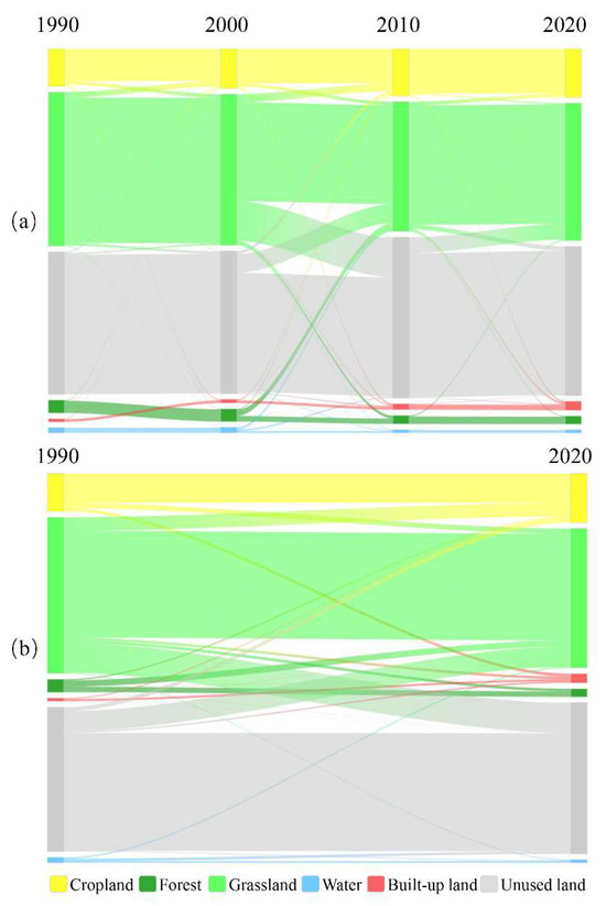 The overall transfer sources and destinations of various land use types in the UCS region from 1990 to 2020 are summarized as follows. The cropland area increased overall, with an inflow of 4894.89 km2, mainly from grassland and unused land, and an outflow of 2135.11 km2, primarily to grassland and built-up land. The forest land area decreased overall, with an inflow of 700.87 km2 primarily from grassland and cropland, while 1912.36 km2 was converted mainly to grassland and cropland. The grassland area also declined, with 8064.92 km2 of land converted to grassland, mostly from unused land and forest land. Meanwhile, 386.57 km2, mainly from unused land and grassland, was converted into water areas, while 942.69 km2 of water was transformed into other land types, primarily unused land and grassland. The built-up land area expanded substantially, with 1756.30 km2 converted from various land types, primarily from cropland and grassland. Conversely, only 284.72 km2 of built-up land was converted into other land types, mostly cropland and grassland. A total of 8159.83 km2 of land, mainly grassland and water areas, was converted into unused land, while 6511.57 km2 of unused land was transformed into other land types, primarily grassland and cropland. As illustrated in Figure 7, between 1990 and 2000, land use changes mainly occurred between cropland and grassland, while the extent of unused land remained largely unchanged. During 2000–2010, land conversion intensified, particularly between cropland and grassland, as well as between unused land, grassland, and forest land. In the period from 2010 to 2020, the most pronounced shifts were observed between grassland and unused land. Over the entire period from 1990 to 2020, land conversion primarily took place between grassland, unused land, cropland, and forest land, whereas built-up land had a relatively low transfer volume. However, all land types contributed to the expansion of built-up land, with cropland, grassland, forest land, and unused land being the most significant sources.