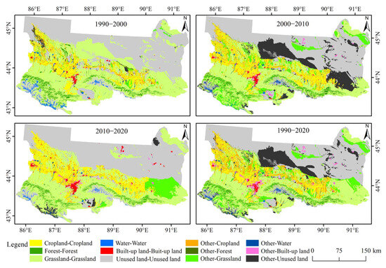 - Li, X.; Qin, D.; He, X.; Wang, C.; Yang, G.; Li, P.; Liu, B.; Gong, P.; Yang, Y. Spatial and temporal changes in land use and landscape pattern evolution in the economic belt of the northern slope of the Tianshan Mountains in China. Sustainability 2024, 16, 7003. [Google Scholar] [CrossRef]