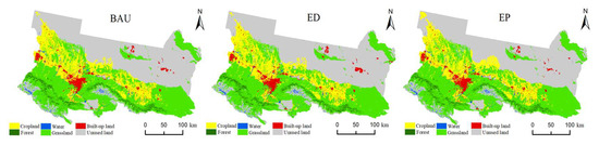 By comparing the simulated land use results under different scenarios with the 2020 land use data, Table 7 shows that unused land exhibited the most significant change across all three scenarios, consistently decreasing. The most substantial reduction occurred under the ecological protection scenario, with a decrease of 3848.31 km2. Grassland area increased in all scenarios, with the greatest expansion observed under the ecological protection scenario, reaching 2941.63 km2. Built-up land grew in all development scenarios, with the largest increase of 943.38 km2 under the economic development scenario. Cropland also expanded in all scenarios, with the most significant growth of 480.00 km2 under the ecological protection scenario. Conversely, forest land and water bodies showed a decreasing trend across all three scenarios, with relatively minor fluctuations in the magnitude of the reduction.