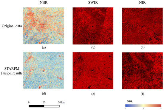 Results of the fusion of the STARFM model used in this paper in a single band (NIR and SWIR) with the vegetation index NBR. Here, (a–c) represent the original images from 18 September 2023, including the NBR index along with the SWIR and NIR bands, respectively. The remaining images (d–f) are their corresponding predicted images.