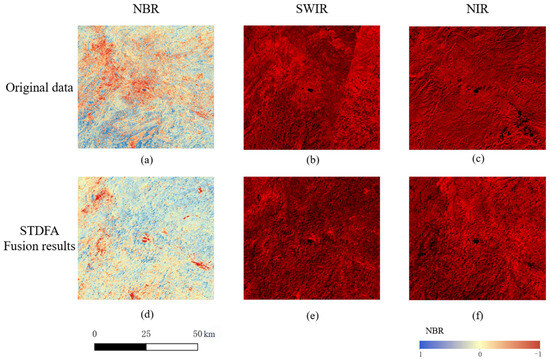 Results of the fusion of the STDFA model used in this paper in a single band (NIR and SWIR) with the vegetation index NBR. Here, (a–c) represent the original images from 18 September 2023, including the NBR index along with the SWIR and NIR bands, respectively. The remaining images (d–f) are their corresponding predicted images.