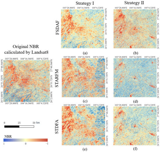 The FSDAF, STARFM, and STDFA models use the NBR results predicted by Strategies I and II, respectively, to compare with the actual NBR. For example, (a,b) are the prediction results of the FSDAF model using Strategy I and Strategy II for respectively, (c,d) are the prediction results of the STARFM model using Strategy I and Strategy II for respectively and (e,f) are the prediction results of the STDFA model using Strategy I and Strategy II for respectively.