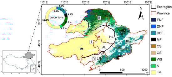 Natural vegetation types and ecoregions of NEC (China Map Examination No. is GS (2023) 2767). Note: HL—Heilongjiang Province, JL—Jilin Province, LN—Liaoning Province, IM—East Inner Mongolia East Autonomous Region; natural vegetation types: ENFs—evergreen needleleaf forests, DNFs—deciduous needleleaf forests, DBFs—deciduous broadleaf forests, MFs—mixed forests, CS—closed shrublands, OS—open shrublands, WS—woody savannas, S—savannas, GLs—grasslands; the four ecoregions: I—temperate grasslands, II—cold–temperate deciduous–coniferous forests, III—temperate coniferous–broad-leaved mixed forests, and IV—warm–temperate deciduous broad-leaved forests.