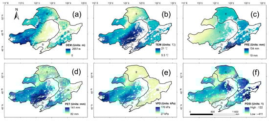 Distribution of elevation and different climate factors in the NEC: (a) DEM, (b) TEM, (c) PRE, (d) PET, (e) VPD, and (f) PDSI. Note: DEM—digital elevation model; TEM—temperature, PRE—precipitation, PET—potential evapotranspiration, VPD—vapor pressure deficit, PDSI—Palmer drought severity index.